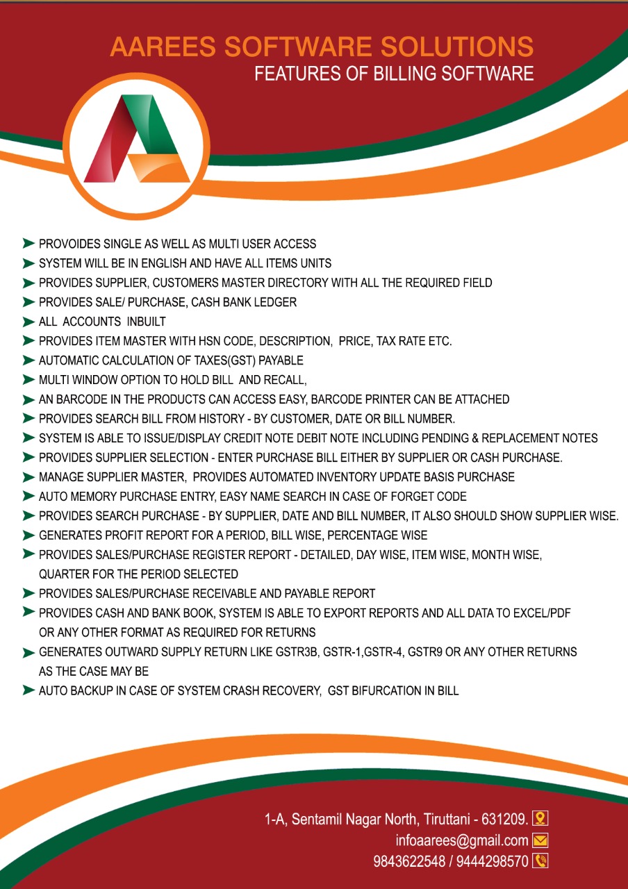 • GST Handling is so easy with Aarees Billing Software and ready to submit format